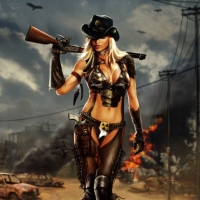 a female character wearing an outfit that resembles a Western style. She is holding a gun with her left hand, and she has