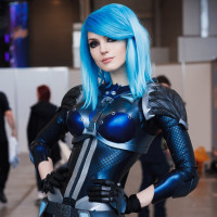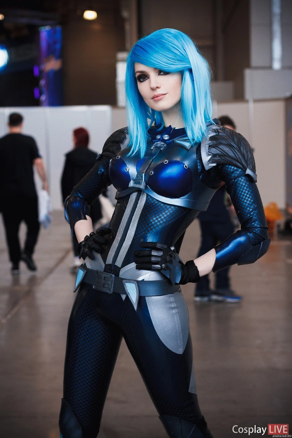 The image shows a person dressed in a costume that resembles armor, often associated with cosplay. The costume is predominantly blue and black, and the person has styled hair to match their outfit. They appear confident, possibly posing for the camera or participating in an event such as