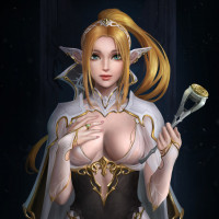 blonde hair tied into twin tails, and she is wearing what looks like armor with intricate designs and a headdress, which suggests she could be a warrior or a figure of importance in her setting. The character is holding what seems to be a staff or wand, adding to the mystical or fantastical element of her appearance. The overall aesthetic is reminiscent of high-fantasy and role-playing game (RPG) artwork.