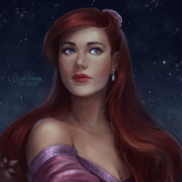 The image depicts an illustrated character who resembles Ariel from the animated movie "The Little Mermaid." She has red hair, blue eyes, and is wearing a pink dress with puffy sleeves. The background suggests a night sky, which adds to the magical theme of her appearance.