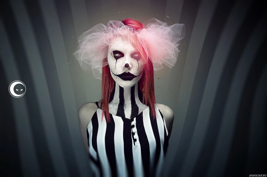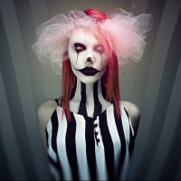 darkened eyes, which may give them a demonic or menacing appearance. Additionally, they appear to have white or pale skin, further contributing to the eerie and unusual effect of their appearance. The person is wearing an outfit that has