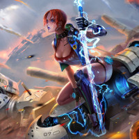 На картинке изображена женщина с рыжими волосами в футуристической броне и с мечом. Она окружена элементами научной фантастики, такими как передовые технологии, возможно, оружие или техника, и она, кажется, находится в разгаре сцены действия, предполагая, что это из жанра научной фантастики.