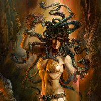 classical mythology. Her gaze is directed towards the viewer, giving the impression of a powerful and seductive character. The overall atmosphere of the image is rich with colors and suggests