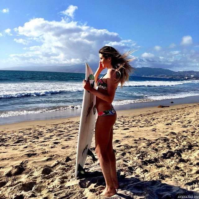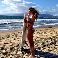 beach setting suggests that she might be preparing for surfing. There's no visible sea in the picture; however, the presence of