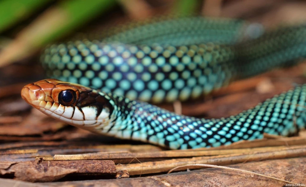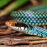 distinctive pattern of coloration that includes shades of green and brown. This type of snake is known for its venomous nature and might be found in various