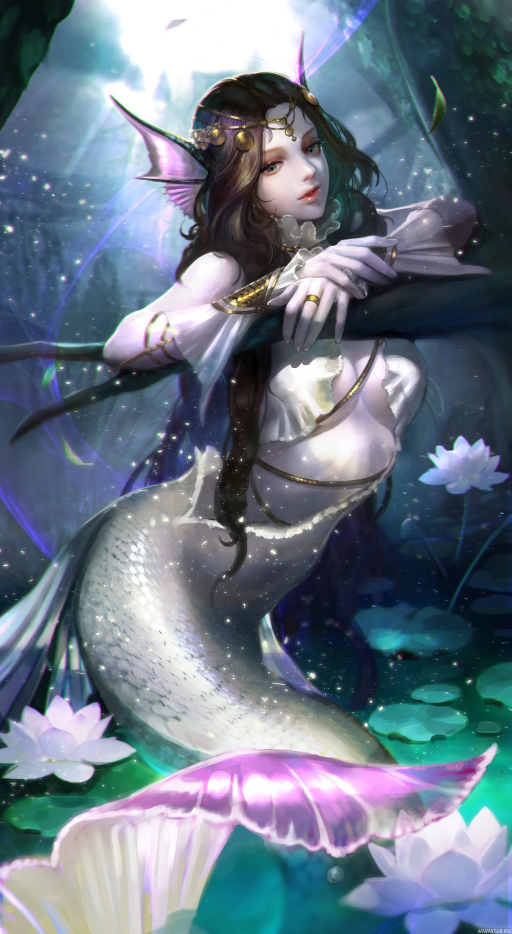long hair and is wearing what appears to be armor or a protective garment, with intricate designs that suggest a magical or royal status. The mermaid is sitting on lily pads in water, surrounded by