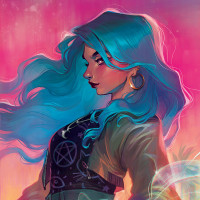 blue hair and a stylized appearance. The character is wearing a jacket and has a somewhat ethereal look, with elements like