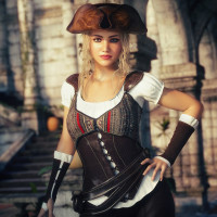 blonde hair and is wearing a costume that includes elements such as a tricorne hat and what appears to be a vest or corset with lace detailing. Her pose suggests confidence or readiness for action. The setting looks like