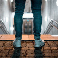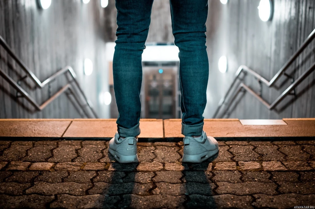 На картинке изображен человек, стоящий на вершине лестницы. Они носят темные джинсы и кроссовки, и их тень видна на земле за ними. Над лестницей есть освещенный знак. Это ночное время, основанное на освещении сцены. Фотография имеет угрюмое или драматическое ощущение из-за освещения и угла снимка, смотрящего вниз с вершины лестницы на заднюю сторону человека.