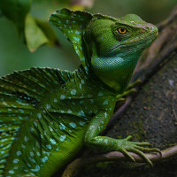 The image shows a lizard that appears to be adapted for aquatic life. It has a long, slender body and a flat tail that resembles a fish's fin. This type of lizard is commonly known as the basilisk lizard due to its aquatic capabilities and the way it moves through water.