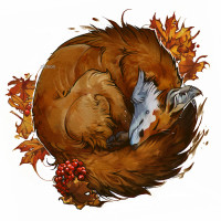 The picture shows an illustration of a fox curled up in a circular shape, resembling the form of a snake or a swirl. The fox is surrounded by autumn leaves and berries, giving it a cozy and seasonal setting. There are also flames surrounding the fox, adding to the warmth and serene atmosphere of the illustration.
