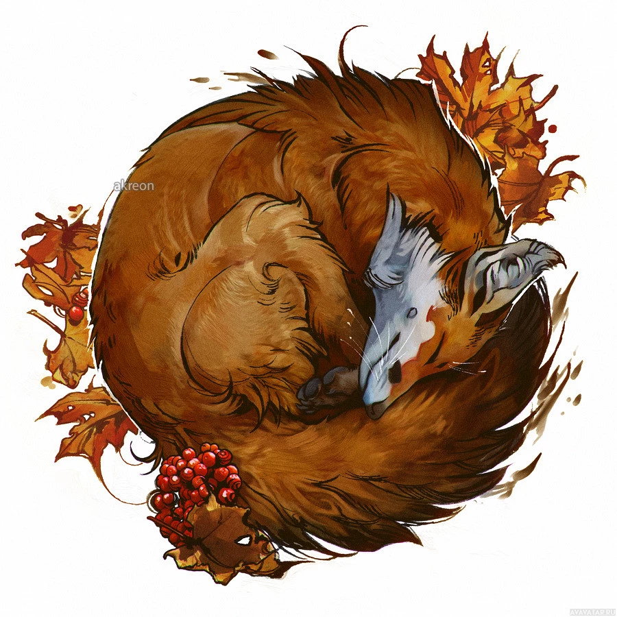 На картине показана иллюстрация лисы, свернувшейся в круглой форме, напоминающей форму змеи или вихря. Лиса окружена осенними листьями и ягодами, что придает ей уютную и сезонную обстановку. Есть также пламя, окружающее лису, добавляющее тепло и безмятежную атмосферу иллюстрации.