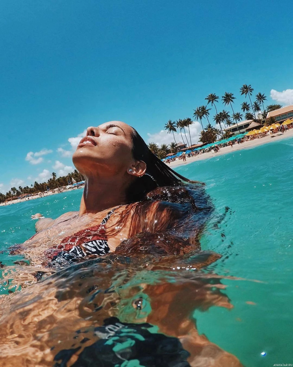 long hair and appears to be wearing a bikini top with a pattern, possibly designed for sun protection or style while swimming. Her eyes are closed as she enjoys her time in the water. There's a palm tree on the beach behind her, suggesting that this is likely at