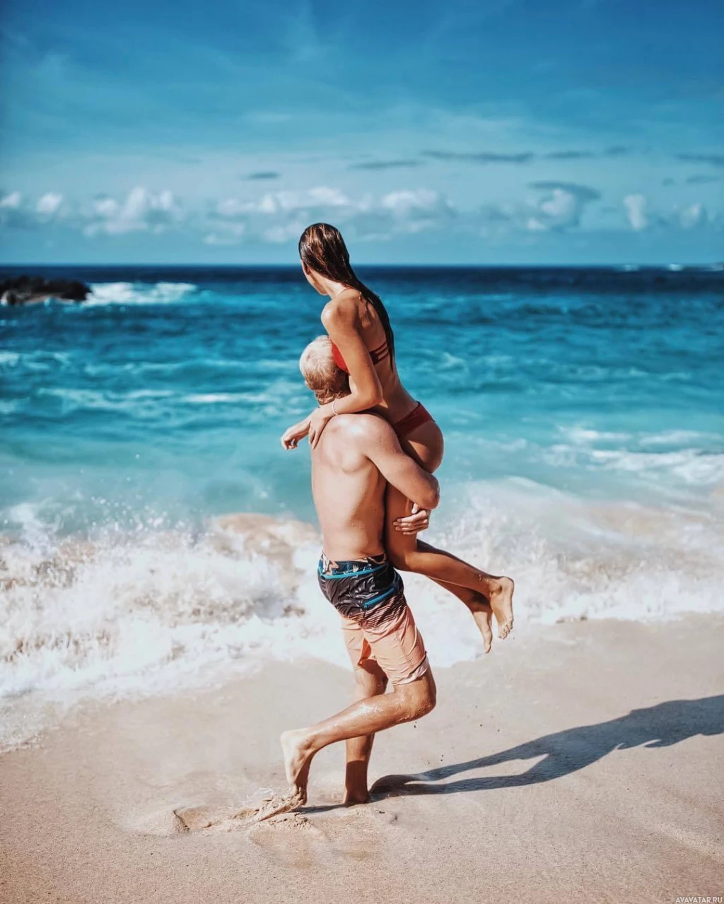 На фотографии изображены мужчина и женщина на пляже. Женщина лежит на плечах мужчины, и они оба улыбаются в сторону камеры. Они, кажется, наслаждаются своим временем на солнце. На этой картине не видно моря; кажется, что она больше фокусируется на двух людях и их взаимодействии, чем на окружающей среде.