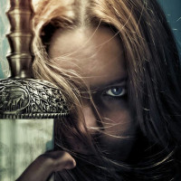 a dramatic pose, possibly portraying a character from a story or mythology. Her expression is serious and focused, which adds intensity to the scene. The background is not distinctly visible due to the close-up of her face and the sword, but it seems to be a stylized setting that could be indicative of a medieval or fantasy setting.