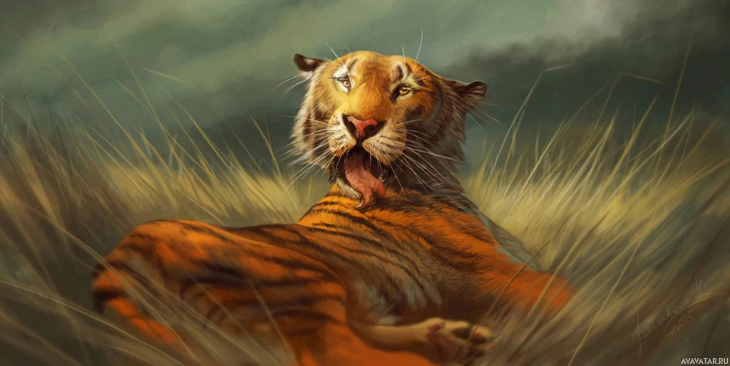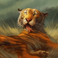 dark clouds looming overhead, suggesting that the weather might be changing or has been affected by a recent storm. The overall mood of the picture is dramatic and somewhat moody due to the contrast between the tiger's