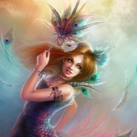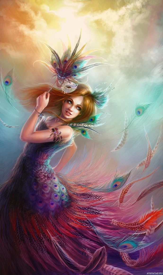 Картинка показывает персонажа, который кажется эльфом или феей, украшенным павлиньими перьями и одетым в то, что кажется красочным нарядом. Фон яркий и предполагает мистическую или волшебную атмосферу.