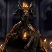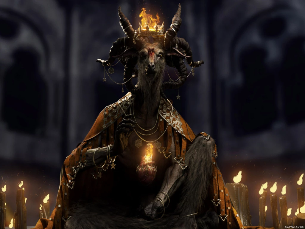 a fantasy scene with a character that appears to be a demonic figure. This character is seated on what looks like a throne, adorned with