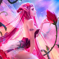 red hair and is wearing what appears to be elven or magical attire. She is sitting on a stem of a rose that seems to be growing out of a tree trunk, which could symbolize