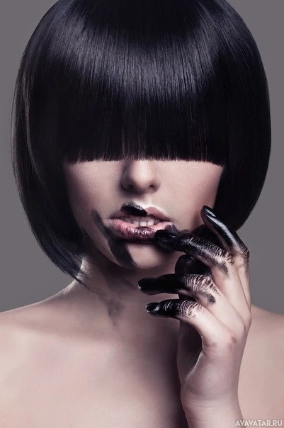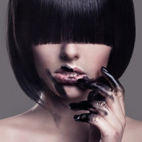 dark hair. She is wearing lipstick and her right hand is holding what appears to be a palette of makeup. Her expression seems contemplative or intense, and she has