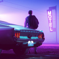 a neon sign that reads "MOTEL" with the text "FAMILY UNITS" visible on it. The overall ambiance of the image is reminiscent of a scene from a crime thriller or noir film due to the foggy setting and