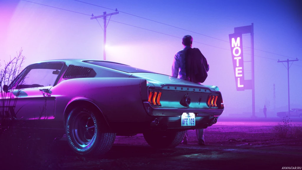 muscle car, specifically a Ford Mustang, parked on the side of a road at night under a foggy or misty atmosphere. There is a character standing beside the car, wearing what appears to be