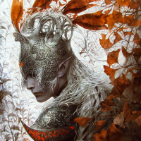 intricate designs and patterns, including what appears to be leaves or feathers on the headpiece. The character's expression is somber or contemplative, looking off to the side. The background has a soft focus with autumnal tones, featuring
