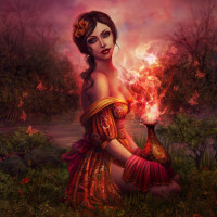 dark hair, is wearing a dress that suggests a historical or fantasy costume, and appears to be holding or manipulating flames. The background shows a dark, ominous sky with clouds and what could be described as a magical, otherworldly environment, possibly a forest or