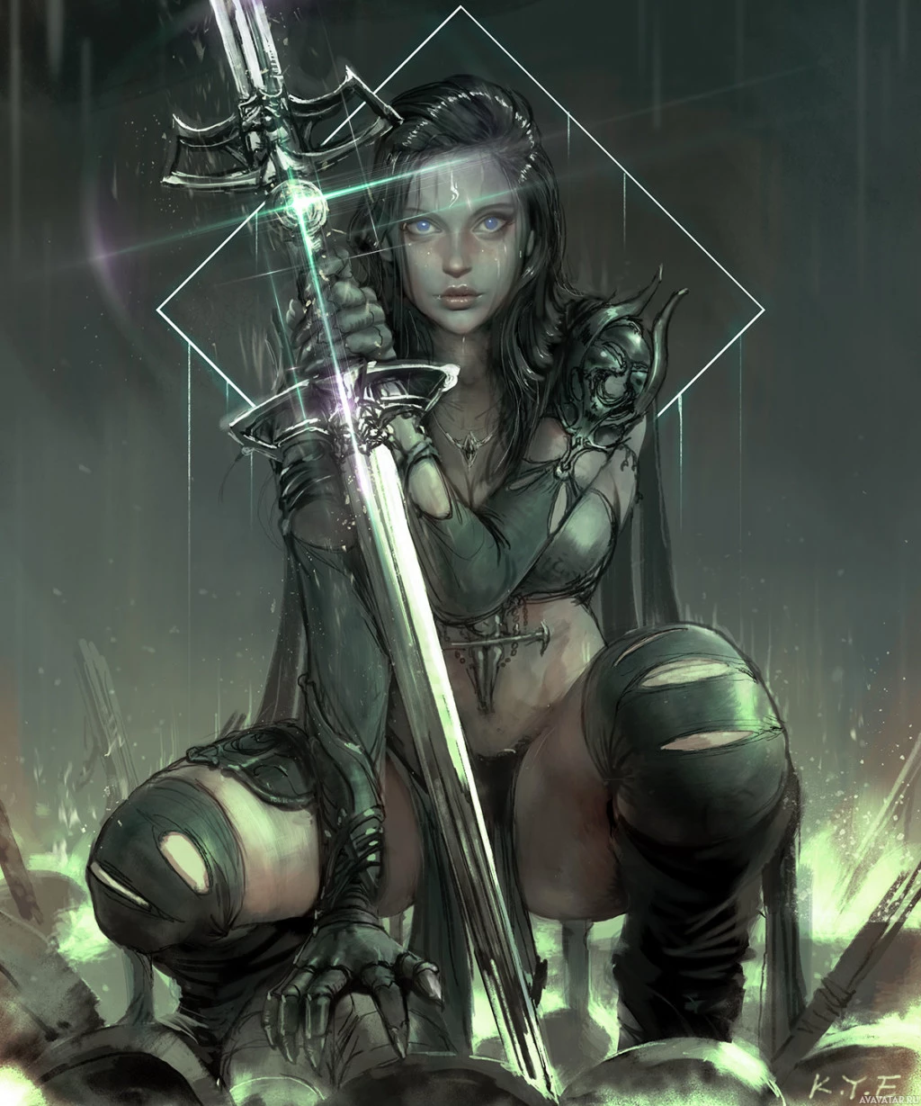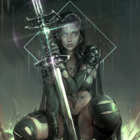 a female character with striking blue eyes, dressed in a fantasy or medieval-style outfit that includes armor and leather elements. She is holding a sword with one hand and has the other hand resting on her hip. Her pose suggests she is a warrior or guardian