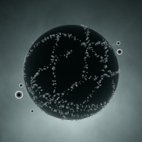 sphere at the center, which could represent a planet or moon in space. Surrounding this central sphere are numerous small white dots that might be interpreted as stars, distant planets, or