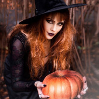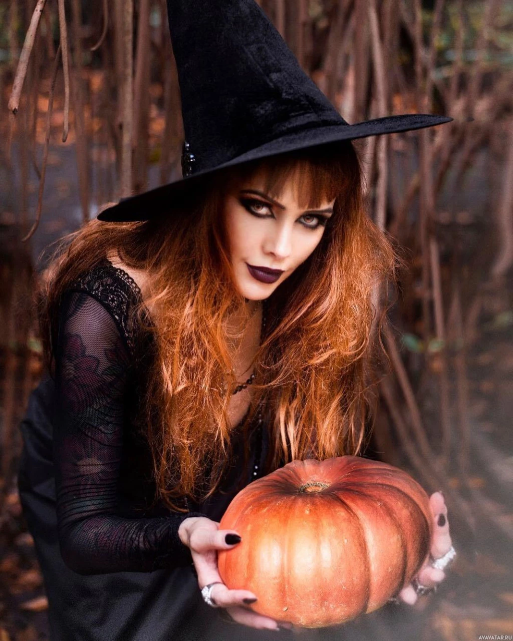 a witch costume, complete with a red wig and makeup. They are holding what appears to be a pumpkin, which is commonly associated with