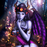 This image features an illustration of a character that appears to be inspired by the game Dota 2. The character is depicted with demonic features, such as horns and what seems to be dark skin or shadow-like complexion. She is wearing a purple dress with
