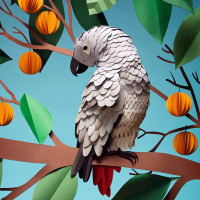The image features a parrot perched on a branch. It has a colorful plumage, with a combination of grey feathers and