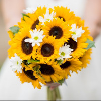 The picture shows a bouquet of sunflowers being held by someone, possibly a bride due to the attire. The flowers are bright yellow with dark brown or black centers. Sunflowers are known for their vibrant color and large flower heads, often used in celebrations and as symbols of happiness.