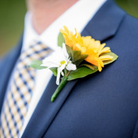 The image shows a man from the back, dressed in formal attire that includes a suit and tie. He has a flower pinned to his lapel, which is commonly known as a boutonniere, signifying an important occasion or event such as a wedding.