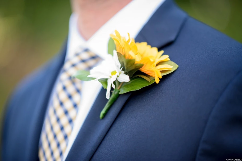 На картинке изображен мужчина со спины, одетый в формальный наряд, включающий костюм и галстук. У него есть цветок, прикрепленный к его лацкану, который обычно известен как бутоньерка, что означает важное событие или событие, такое как свадьба.