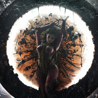 long hair and is wearing a dress with a metallic or armor-like design. The background features an ominous,