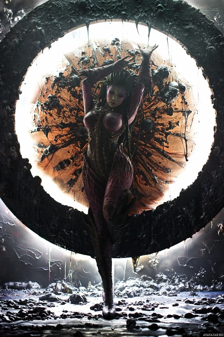 In the image, there is a character that appears to be a representation of Kerrigan from the game "StarCraft." The character is depicted in a dance-like pose with one hand on her hip and the other extended outward. She has