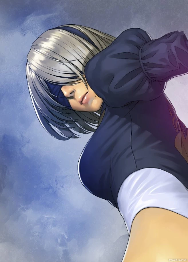 На картинке показана иллюстрация женского персонажа из видеоигры «Nier: Automata». Она изображена со светлыми волосами, в черном наряде и с оружием. Этот персонаж известен своей ролью в игре в качестве одного из главных героев, участвующих в борьбе с механическими врагами.