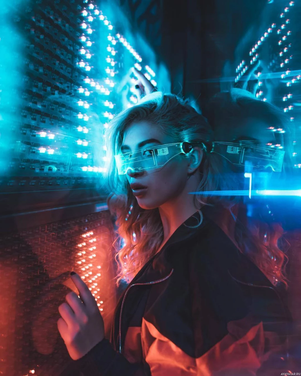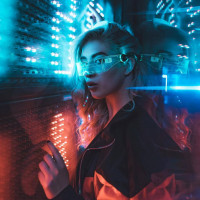 cool blues and reds dominating the color palette. The image could be associated with themes like technology, cyberpunk culture,