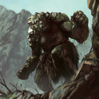 The image shows a fantasy-themed illustration of a troll. The creature appears to be aggressive and is depicted with exaggerated features such as large teeth, sharp claws, and an imposing stature. It's set against a rugged mountainous background which contributes to the wild and untamed nature often associated with mythical creatures like trolls.