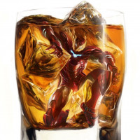 ice cubes and a dark liquid that could be alcohol, possibly representing Iron Man's suit or the character himself. This is an artistic representation and not