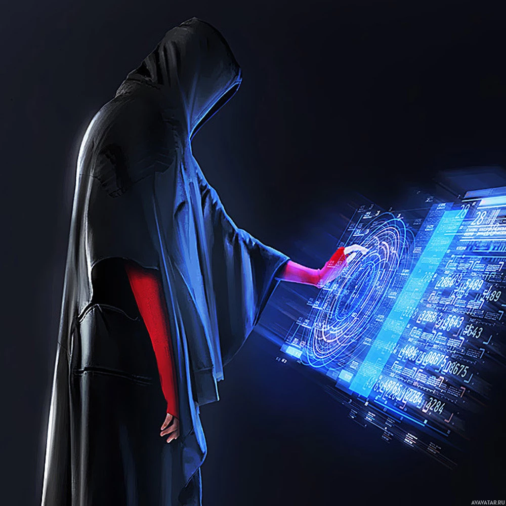 fantasy attire, wearing a hood and holding a futuristic device with their right hand. This juxtaposition suggests the theme of