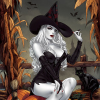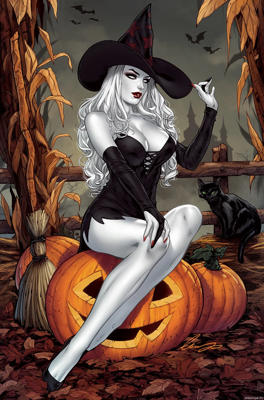 white hair, dressed in a Halloween-themed outfit. She is sitting on a pumpkin and has her legs crossed. In the background, there are elements of