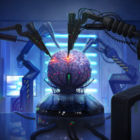 robotic interaction with the brain. The setting appears to be a laboratory or research facility dedicated to exploring neurological processes and enhancing them through