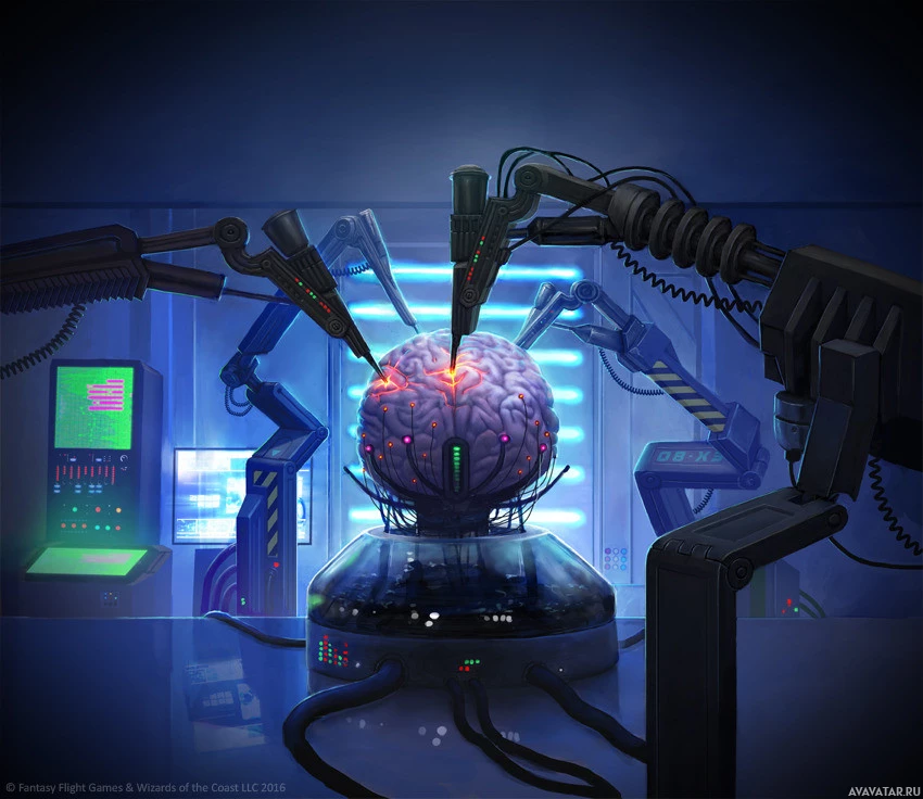 a human brain, which seems to be the subject of scientific study or experimentation. Surrounding the brain are various pieces of high-