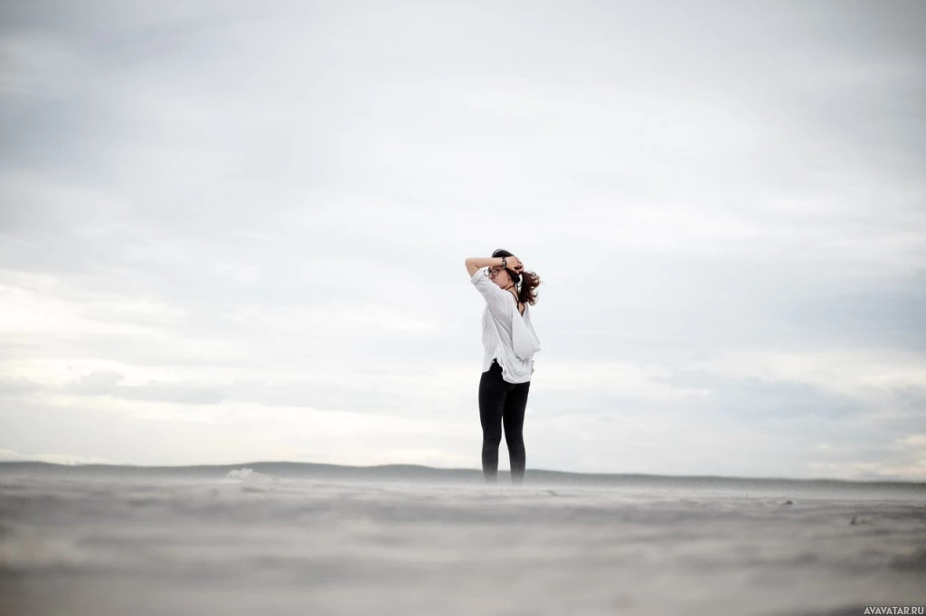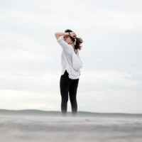 The image shows a person from behind, standing on what appears to be a beach or shoreline. The person has their arm raised above their head, and their hair seems to be blowing in the wind due to their posture. The background is somewhat blurred, indicating that there might be water and possibly clouds or mist present at the time the photo was taken. The overall mood of the picture conveys