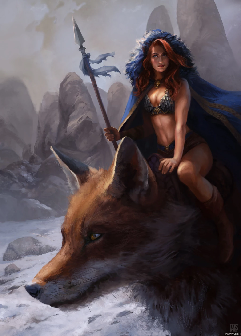 red hair and is riding on the back of a wolf-like creature, possibly a magical or mythological one given the context provided. She holds a lance in her right hand and wears what seems to be a cloak with