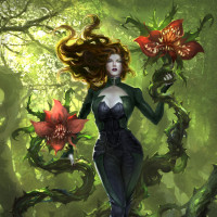 The image depicts a character from fantasy-themed artwork. The central figure appears to be a female with vibrant