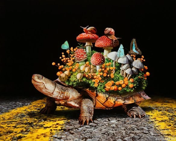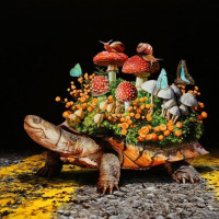 a colorful arrangement resembling a garden or a landscape, featuring mushrooms and other flora. Additionally, the turtle is wearing what looks like a cape made of different kinds of leaves or perhaps